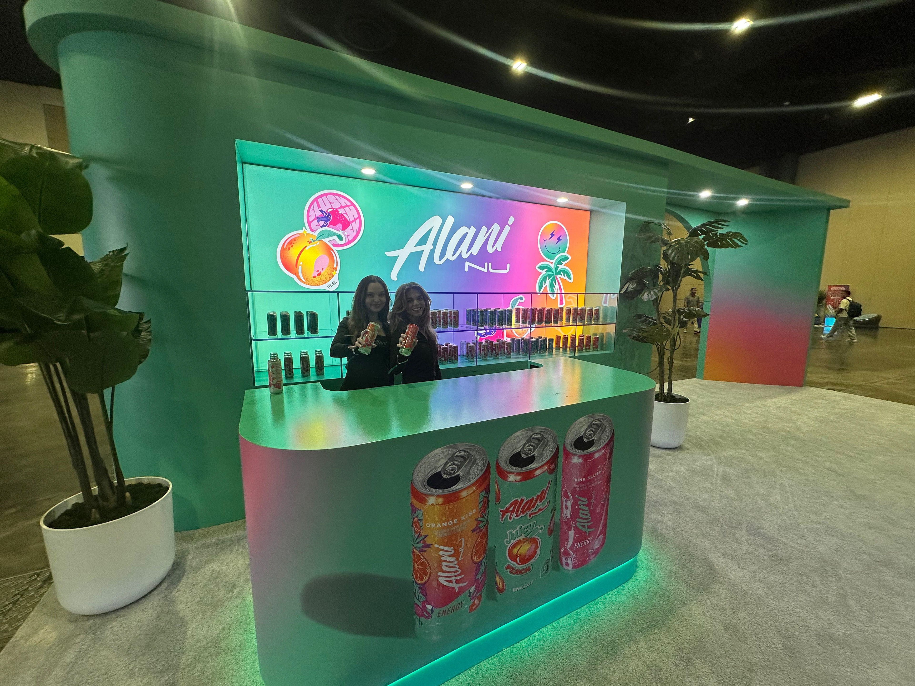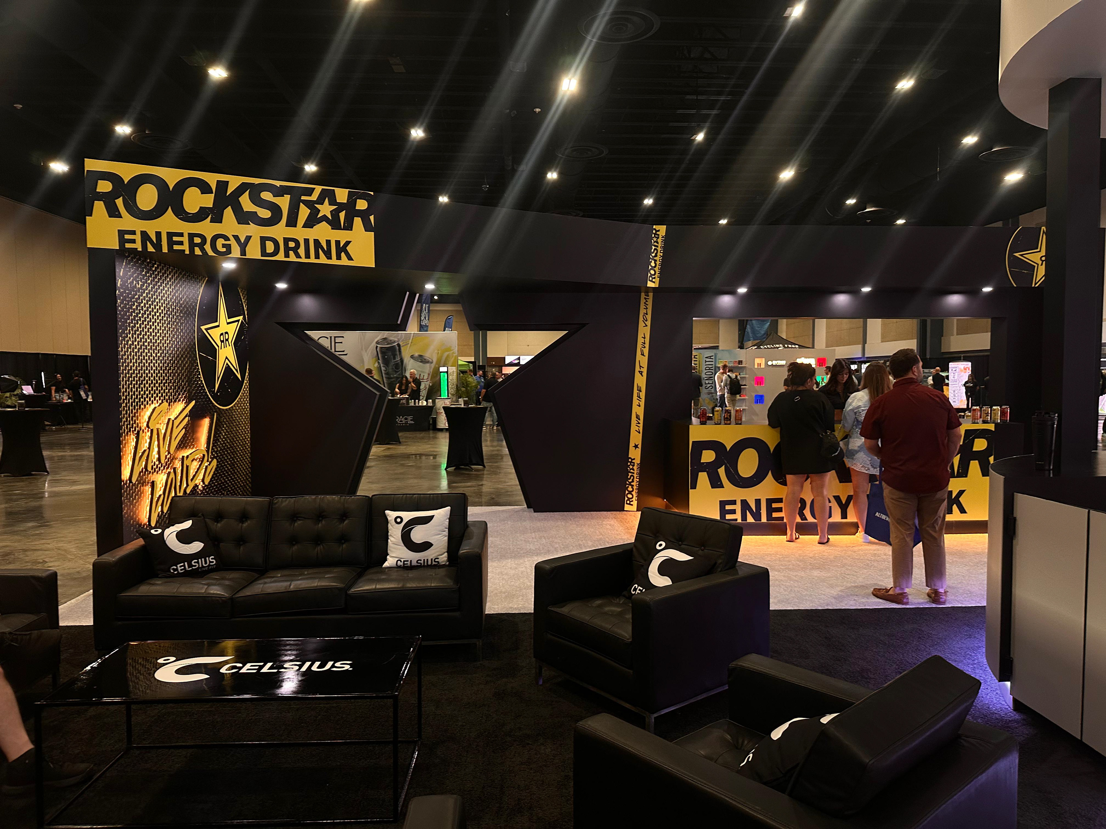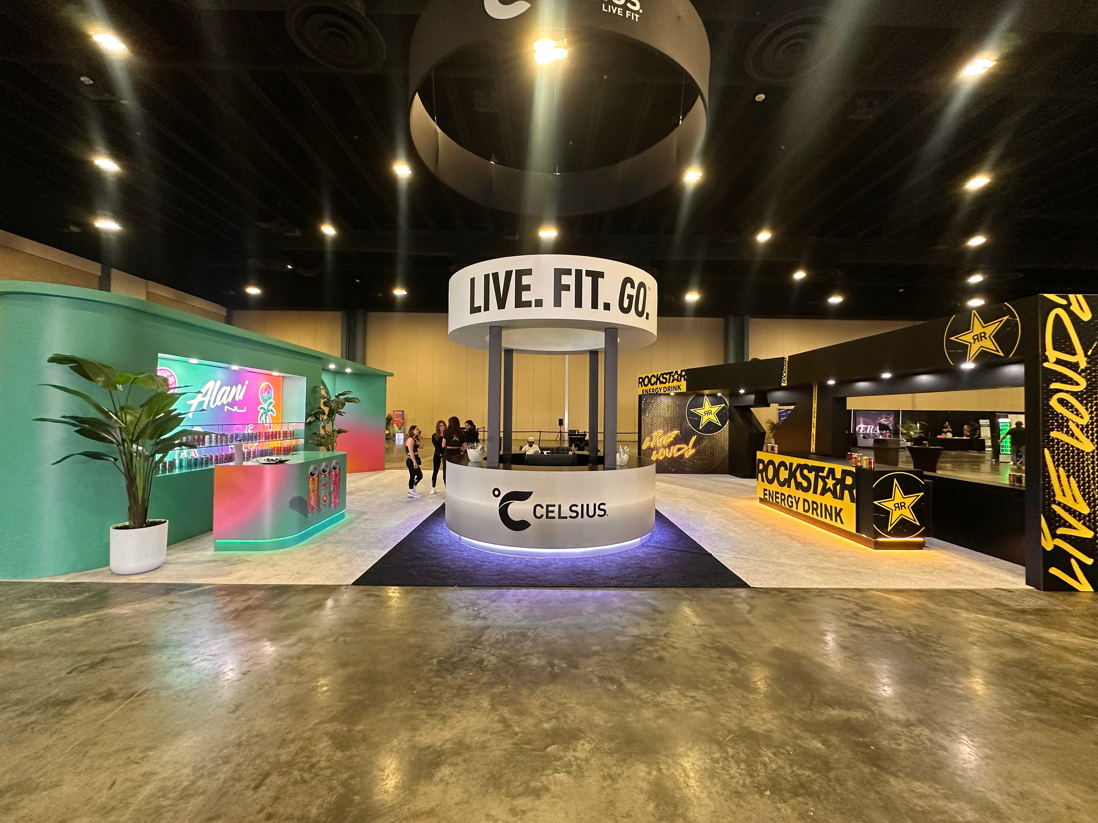 3D visualization of a beverage brand exhibition space featuring Celsius, Alani Nu, and Rockstar Energy booths, designed for Expo West with product sampling areas, lounge zones, and strong brand presence.